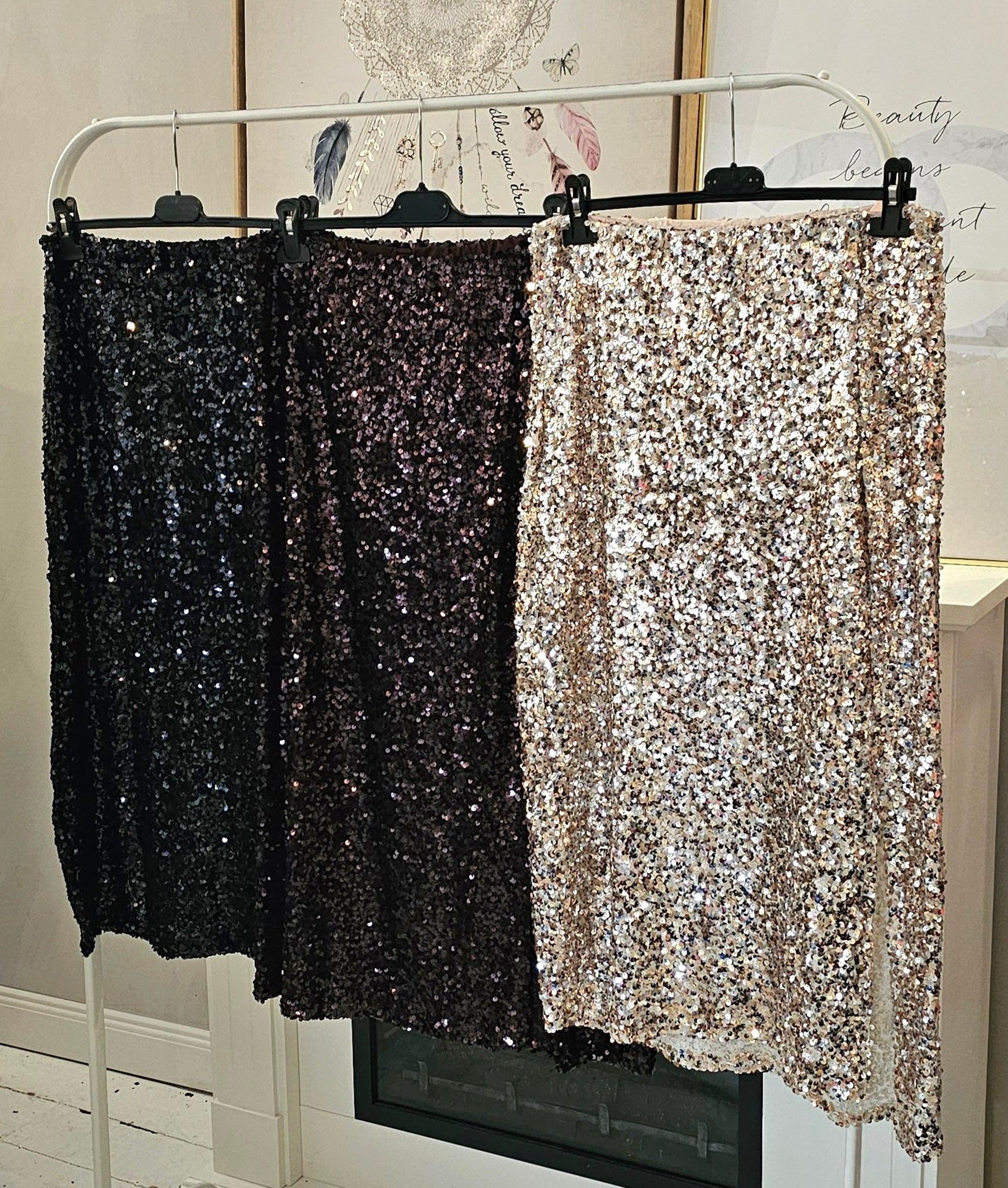 Er besteht aus einem leichten, angenehm zu tragenden Stoff und ist vollständig mit funkelnden Pailletten besetzt, die das Licht bei jeder Bewegung reflektieren. Der Rock hat eine feminine, elegante Silhouette und lässt sich sowohl für festliche Anlässe als auch für stylische Partynächte kombinieren. Dank des elastischen Bundes sitzt er bequem und bietet gleichzeitig einen sicheren Halt
