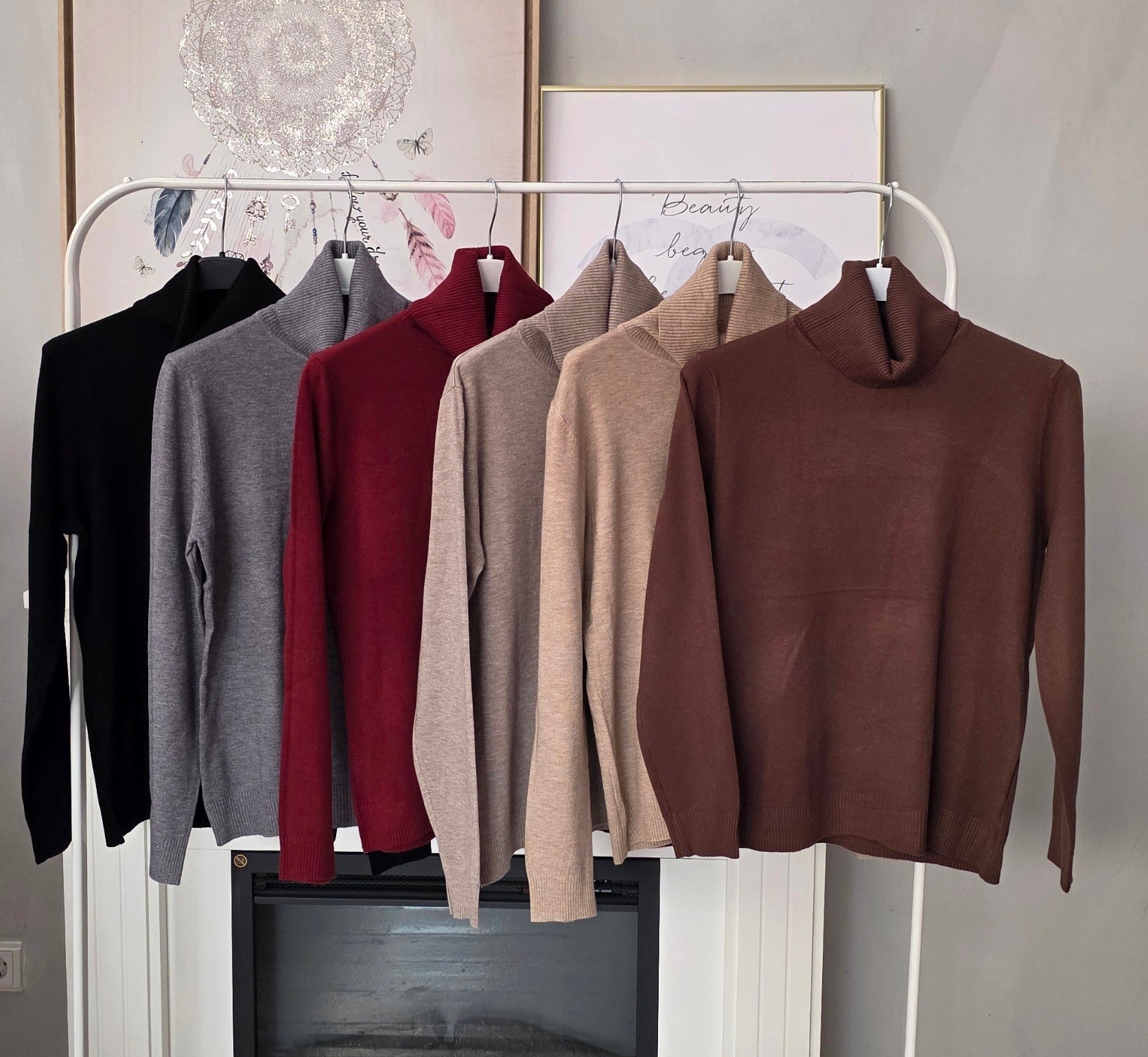 Der Pullover hat lange Arme und einen Rollkragen.