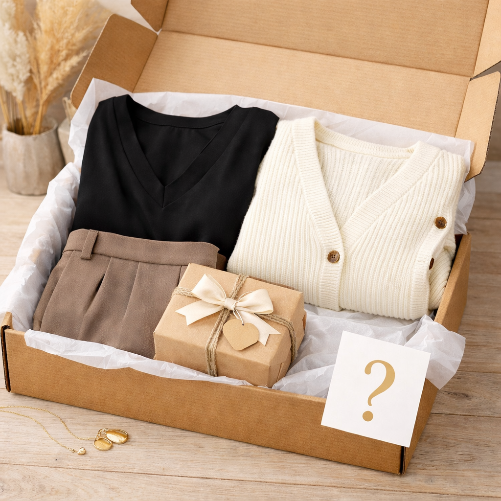In deiner Überraschungsbox findest du ausgewählte Basics aus unserer aktuellen Kollektion. Zeitlose Kleider. Lässige Hosen. Weiche Cardigans. Kombiteile, die du im Alltag, im Büro oder abends tragen kannst. Genau die Stücke, die man morgens blind aus dem Schrank nimmt und weiß, es passt.
