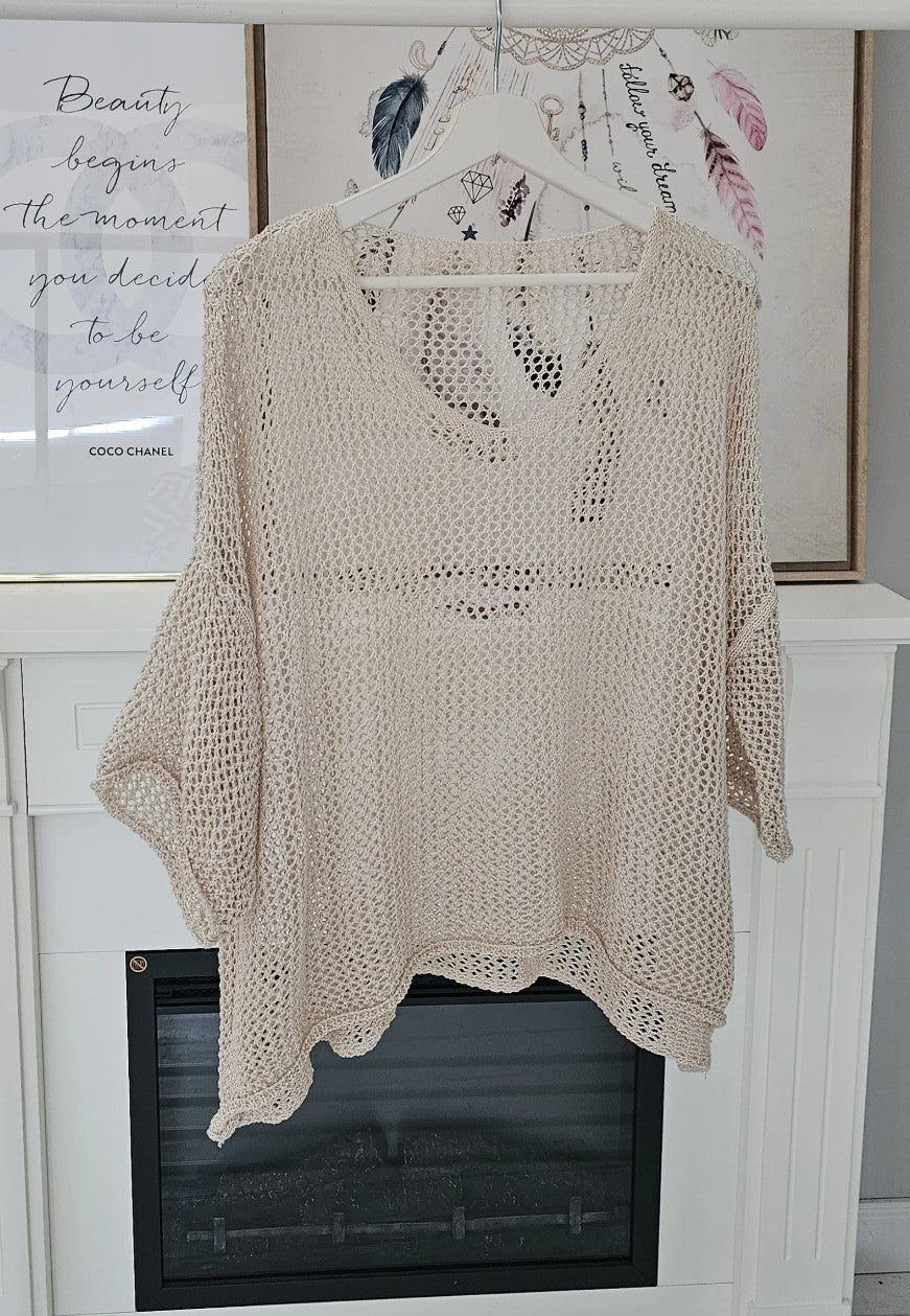 Lochstrickpullover mit 3/4 Arm V-Neck sommerlich leicht Einheitsgröße Gr.36-40 Material. 12 %Nylon 88% Acryl Länge ab Schulter: ca..65 cm Brustweite ca. 81 cm waschbar bei 30 Grad Handwäsche empfohlen